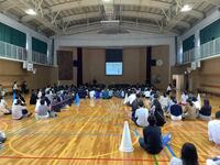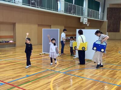 道路を歩く時の注意点や安全な歩き方について、体育館でシュミレーションしたり、クイズをしたり楽しく学びました。