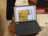 物語を読み、言葉に注目し展開や登場人物が変わっていく様子を捉え、起承転結に合わせて場面設定(4コマ漫画)し、吹き出しを付けていきました。4コマ漫画を作成する場面ではタブレットを使い、文章を打ち込んでいます。