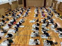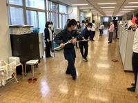 密を避けて、廊下で間隔を開けて個人練習をしています。壁に貼られた足型シールが目印です。