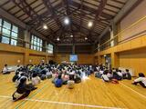 体育館で出発式をしました。体育館から見る空には晴れ間も見えました。