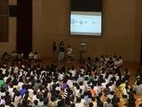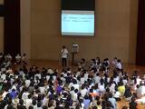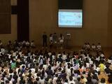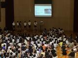 クラスごとに、修学旅行で学んだことを全校生徒に向けて伝えました。